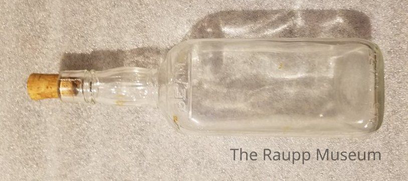 One (1) alcohol clear glass bottle, with the name "BEAM" embossed on one side. The bottle is rectangular shaped with a thin round neck and raised lip. (possibly Jim Beam, Bourbon Whiskey maker). No paper label is on the bottle. There is a cork in the neck of the bottle.