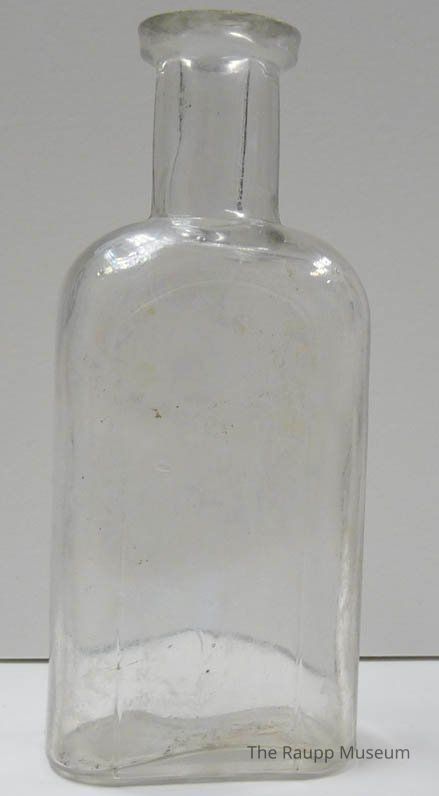 Clear rectangular shaped glass bottle with rounded edges and neck for a cork stopper, no lid. With vertical side seams and slight embossed outline on the front where a label might have been applied.Dimensions