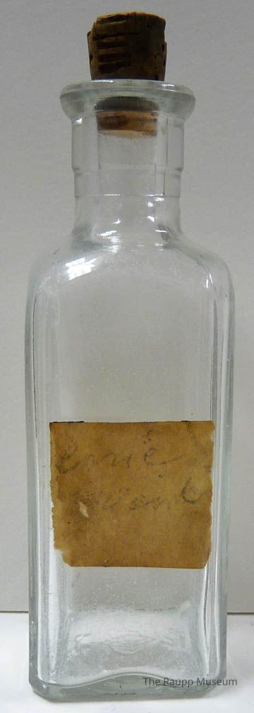 Clear square glass bottle with rounded edges and cork stopper. With square tan paper adhesive label on the front. Could not read the writing on it. Maker's mark on base.Dimensions