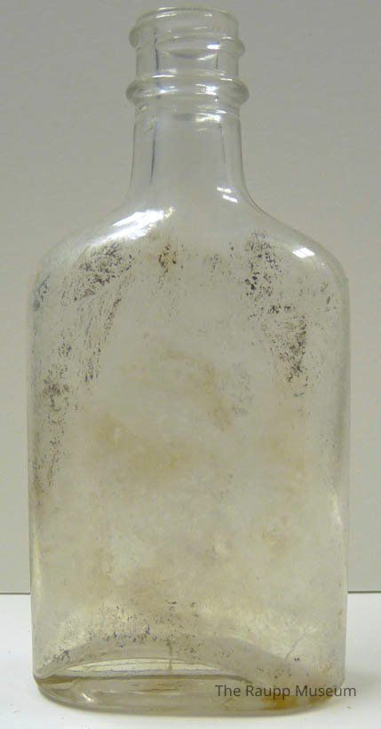 Clear oval glass liquor bottle with long neck and screw top grooves. Embossed base with a diamond shape superimposed in a circle factory mark and number "5."