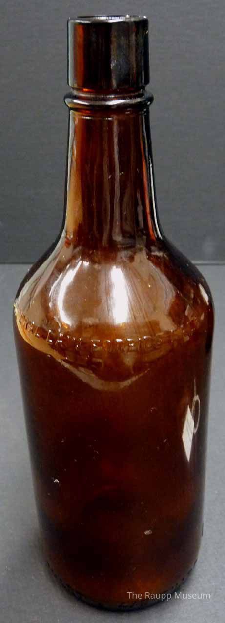 Brown glass bottle with round shape and long neck. Embossed text around the circumference of base of neck and base. With single vertical mold seam running the length of bottle. With embossed text on bottom of base in a circular compass-like pattern.Dimensions