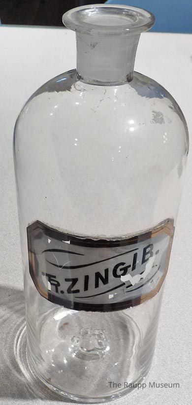 One (1) clear glass apothecary bottle. Bottle is conical with a rounded top that comes to a narrow rounded neck opening. One side has a metal platted holder for a label, with a white label inside that has: "TR. ZINGIB.". The top of the spout is clouded glass, the rest is clear. There is some embossing on the center bottom. Item is directly labeled on the bottom.