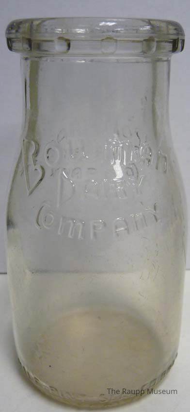 Clear glass, half-pint milk bottle with round shape and tapered neck. The lip is flared with indentations around the exterior rim. Clear embossing on two sides of the body of the bottle: "Bowman's Dairy Company." Two seams run the length of the body.Dimensions