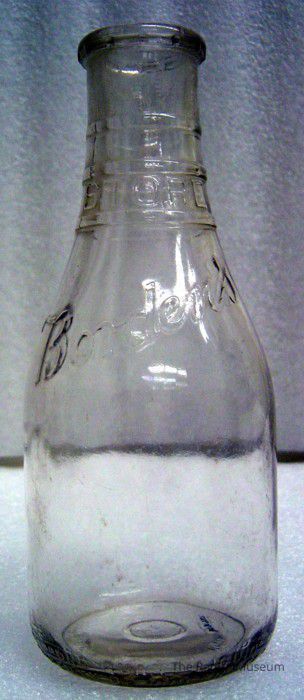 One (1) clear glass 1 quart milk bottle from Borden's dairy company. Two circles on bottom with smaller circle in the middle. 3 rings are around the neck. Marks include: "Store" stamped on neck; "Borden's", "mTc"; "One quart liquid", "Property of and filled by Borden's Chicago", "Sealed 11" stamped around bottle; "45", "S", "Reg. U.S. Pat. Off." Stamped on bottom.Dimensions