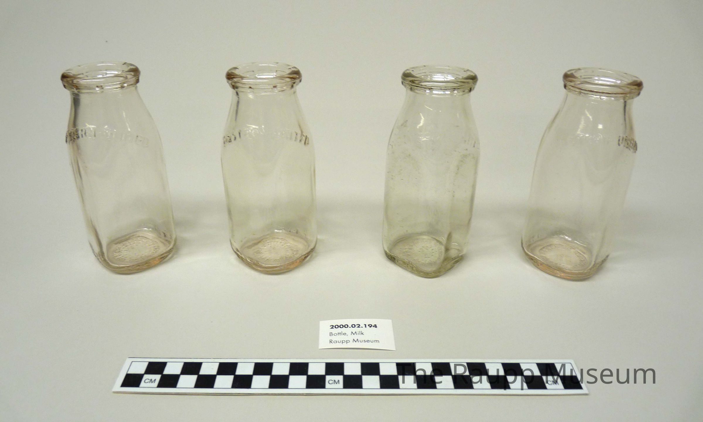 Four (4) half pint milk or cream bottles. Made of clear glass, square shaped with round necks and 10 ridges near the rim. Marks on side: "Western United", and on bottom: "Western United, Chicago, ILL 25 52".Dimensions