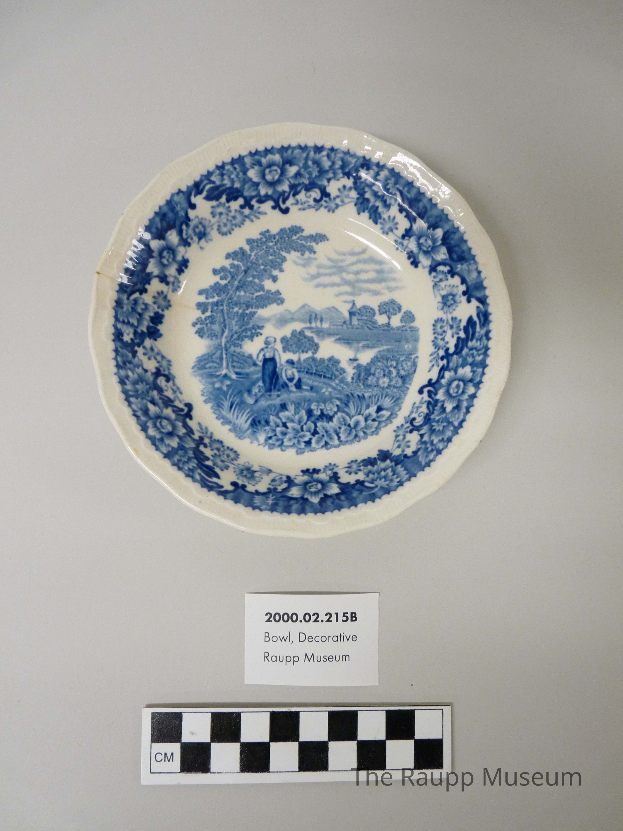 One (1) blue and white china bowl. Small, shallow bowl with blue design of land and nature on inside. On bottom is stamped in blue: "Swinnertons, Staffordshire England", "Silverdale".