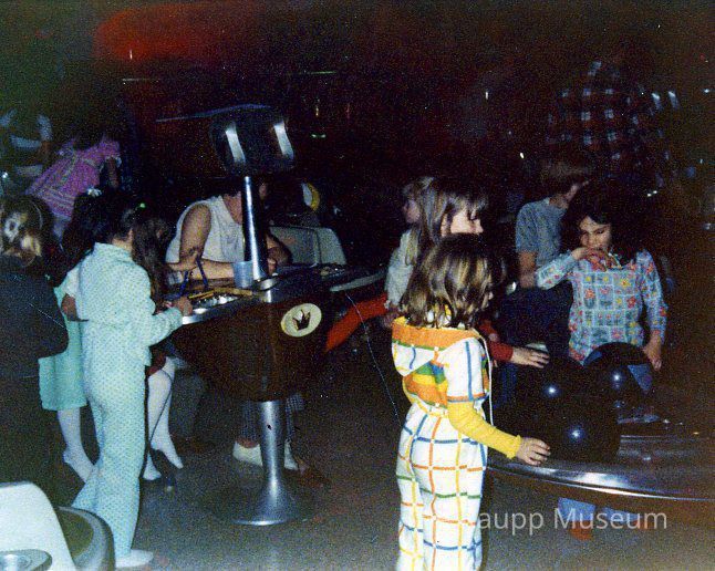 Color print. Image of elementary school aged girls at the bowling alley. Some of the girls are selecting bowling balls, while others are looking at the scoring table. Girl in the foreground is wearing an orange and white plaid jumpsuit. Printed on Kodak paper.Dimensions