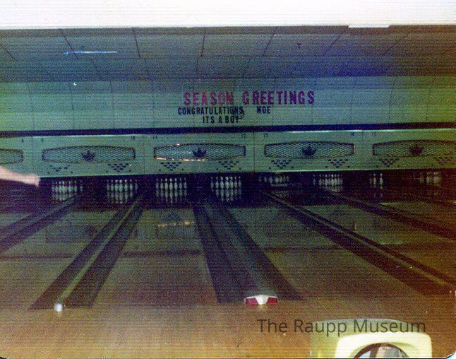Postcard printed on textured photographic paper. Image is an amateur color photo of an empty bowling alley with the pins set. There is a sign hanging in the back above the pins reading "Season Greetings; Congratulations Moe; It's a Boy."