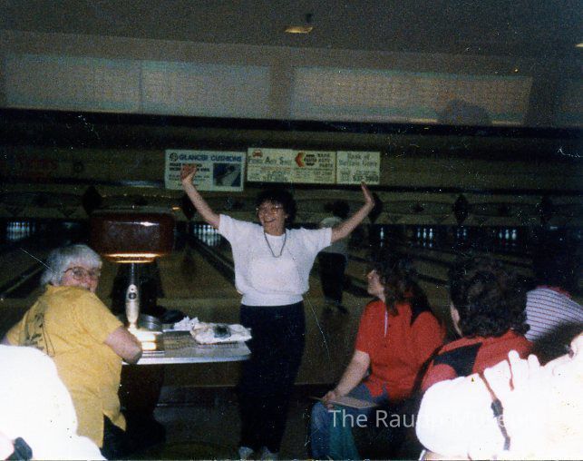 Color print. Image of four ladies at the bowling alley. Woman on the far left is wearing a yellow shirt. The center woman in a white shirt appears to be celebrating a good score. With 1987 written in blue ink on the reverse.