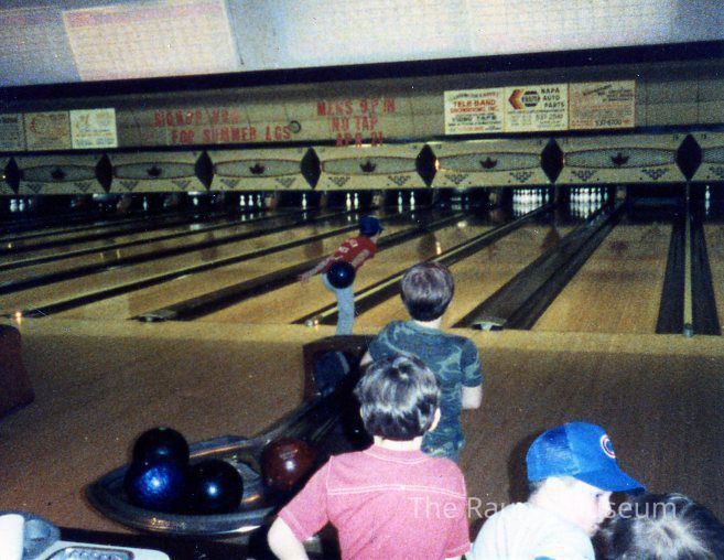 Color print. Image of the backs of five elementary school boys bowling. Four boys watch as one prepares to throw a bowling ball. Bowler has a red t-shirt on. Background text above the lanes: “Men’s 9 PM NO TAP APR 21.”Dimensions