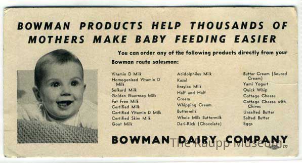 Rectangular cardboard advertisement with black and white text for Bowman Dairy Company. With image of a happy baby on the left and list of offered products on the right.Archive Details