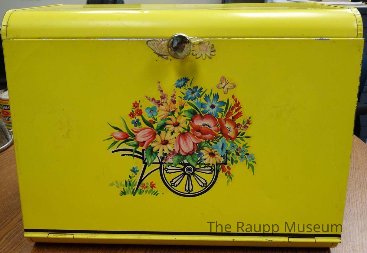 Metal bread box with hinged lid and metal handle knob. Painted yellow exterior with multi-colored flowers in a wheelbarrow. Interior is shiny silver metal color with a shelf.Dimensions