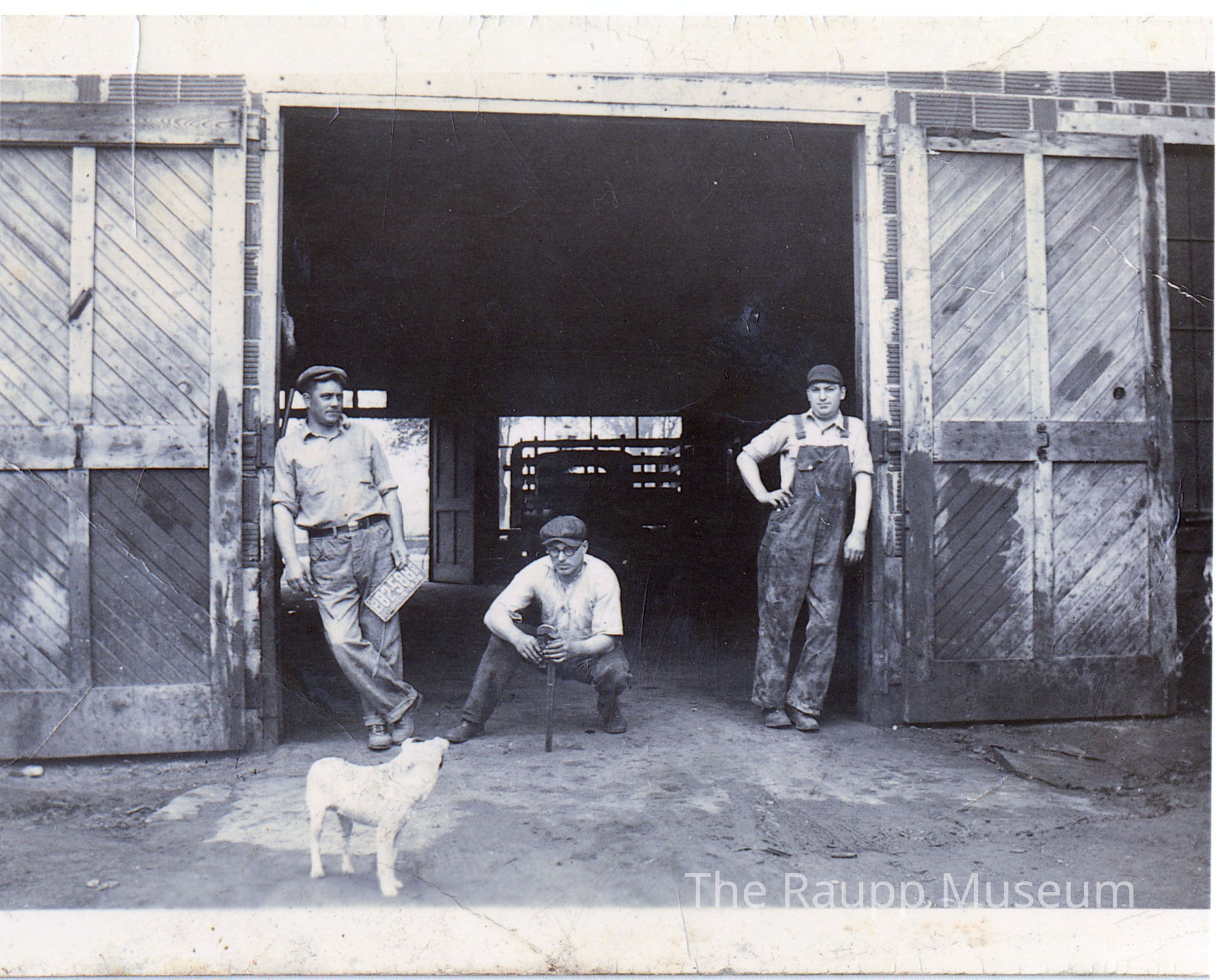 One (1) color photograph copy of the Brehm Garage in 1936. The photo is black and white with three men at the entrance to a car garage. The man on the left is leaning against the sliding door and holding a license plate. The man in the middle is kneeling down, holding a wrench, and looking at a white dog looking at him in front on him, and the man on the right is leaning against the right door in overalls. Behind them there the bed of a truck and a car visible.Relationships