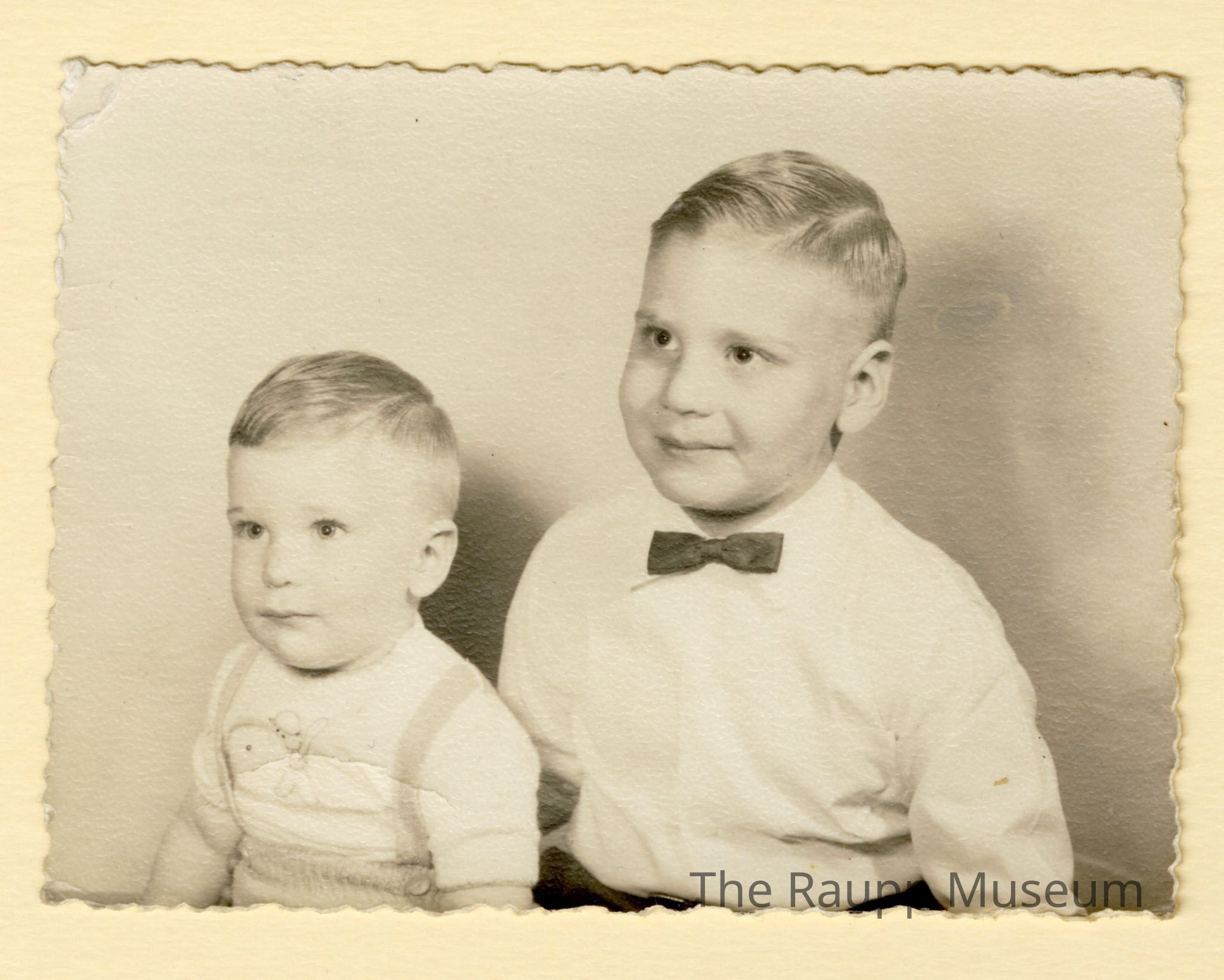 One (1) black and white photograph, sepia toned, of Frank Eul III and Brian Eul as toddlers and baby. Brian is on the left and pictured in grey overalls and white shirt. Frank has white shirt and black bow tie on. They are smiling and looking to the side.