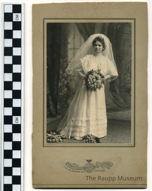Black and white print mounted to a tan card with black border. Studio logo on mat below the image. Unidentified woman wearing a large locket, white wedding dress with wide ruffled, lace yoke, puffed sleeves and tiered hem. She is holding a large bouquet of roses; two other bouquets at her feet. Studio backdrop with a window and column behind her.