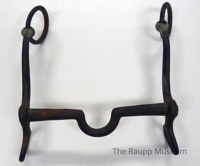 Brown metal horse bit in a fixed cheek walking bit style. H-shaped: two curved vertical posts either side of an arched bar mouthpiece. Side posts both have fixed loops on one end, rings at other end.Dimensions
