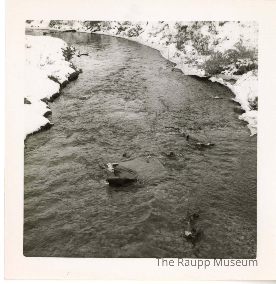 One (1) black and white photograph of Buffalo Creek water running in the winter. There is snow on the banks, but most of picture shows the water.