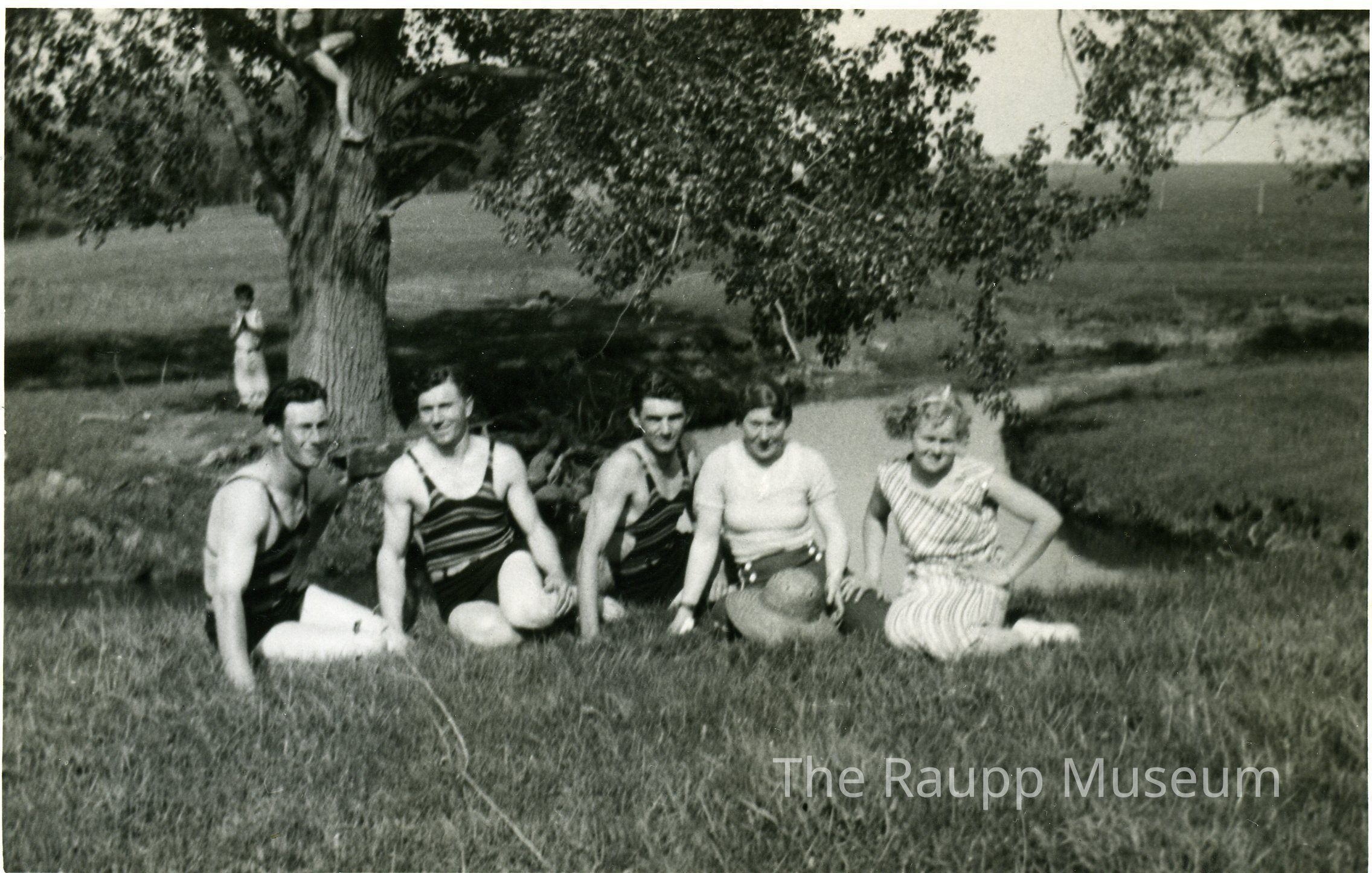 Black and white image with white border printed on glossy paper. Image of six people at Buffalo Grove creek. Three men and two women all wearing bathing suits are seated in a row in the grass, a young boy standing by a tree in the background. Blue ink date "1936" written in center of lower white border on front.