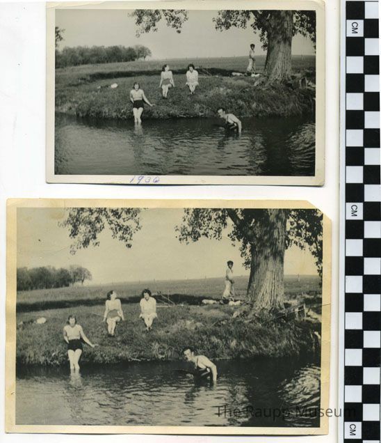 Accompanying archivist note indicated: "Swimming at waterhole. Buffalo Creek corner of Lake-Cook Rd and Raupp Blvd. (Emmerich Park). L to R Ruth Borre (Mrs. Joe) Emmerich, Louise Emmerich, Gladys Welter [Gerschefske Marino], Eugene Welter (younger brother), Urban Welter in water (older brother). C. 1936"Relationships