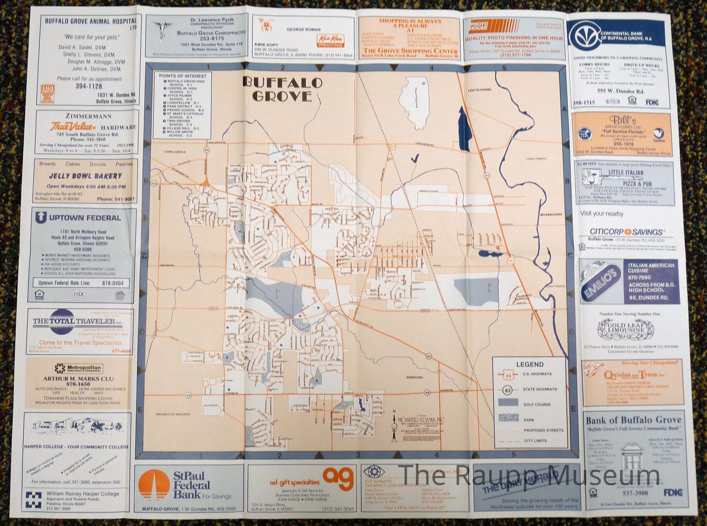 Double sided, gray and orange color street map of Buffalo Grove area. Front side of map has points of interest box in the upper left position with "Buffalo Grove" in black next to it. Map legend is located in the lower right corner. With a border of advertisements for local businesses.
