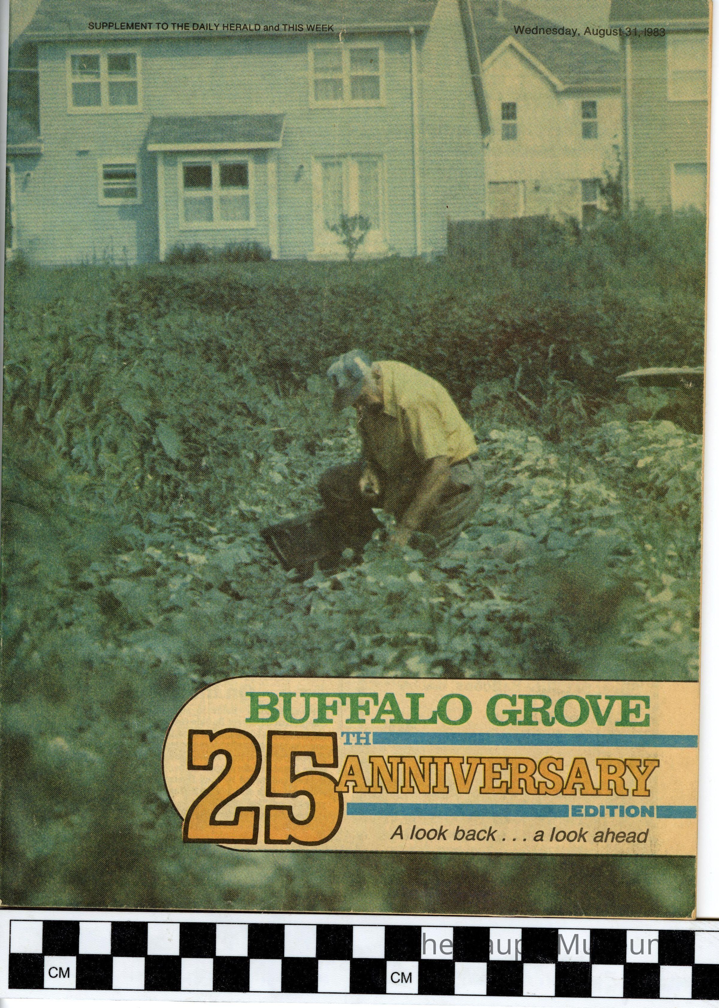 One (1) 25th anniversary booklet, a "supplement to the Daily Herald and This Week." Booklet is printed on newspaper type paper, and has short articles and pictures about the people and places of Buffalo Grove and how it has changed. The cover is a color picture of a man farming behind a neighborhood.