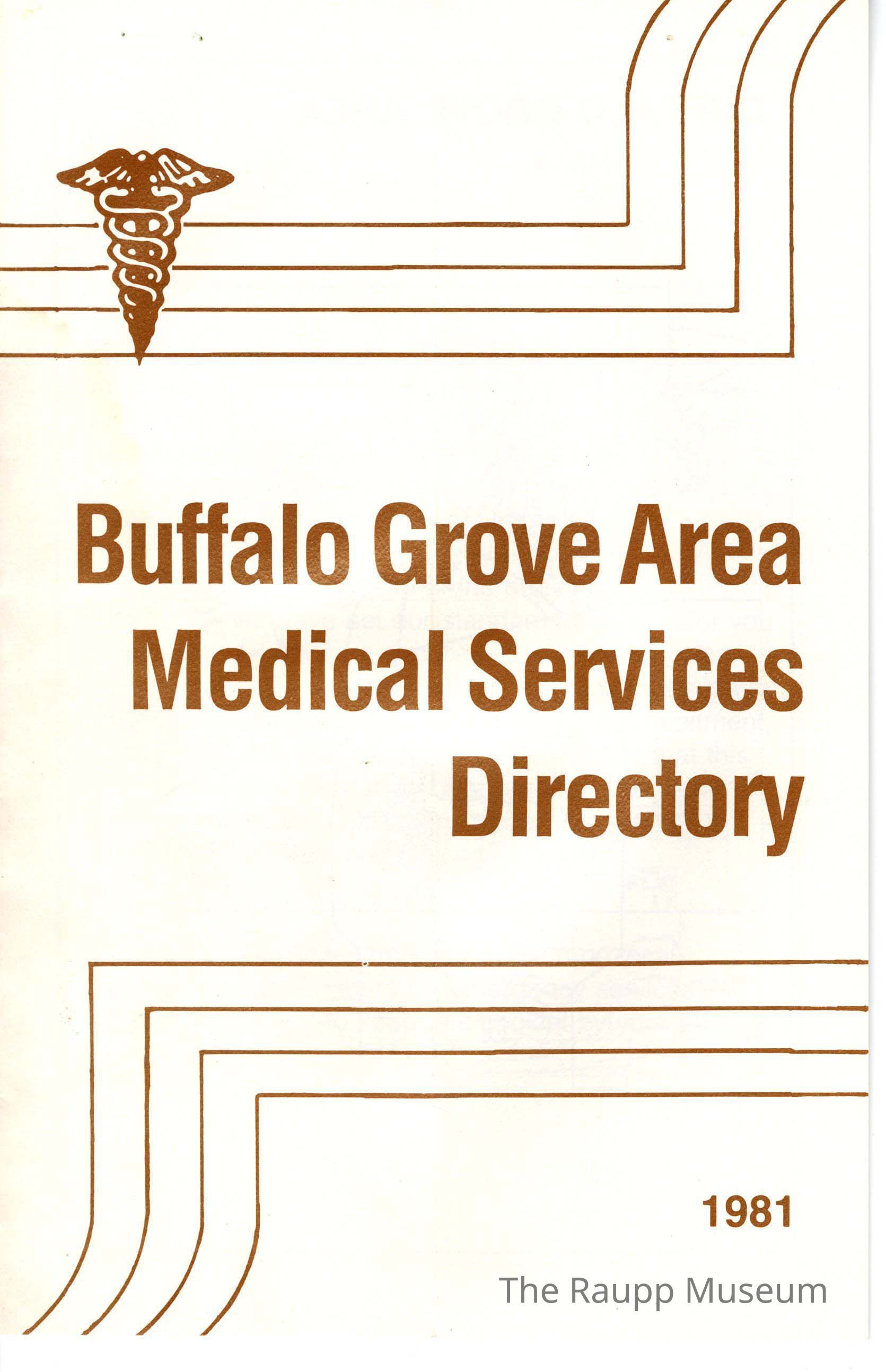 One (1) 8-page booklet of Buffalo Grove area medical services, printed in 1981. The cover has brown text and a medical symbol. The pages are reinforced paper. Includes medical professionals and offices and pharmacies.