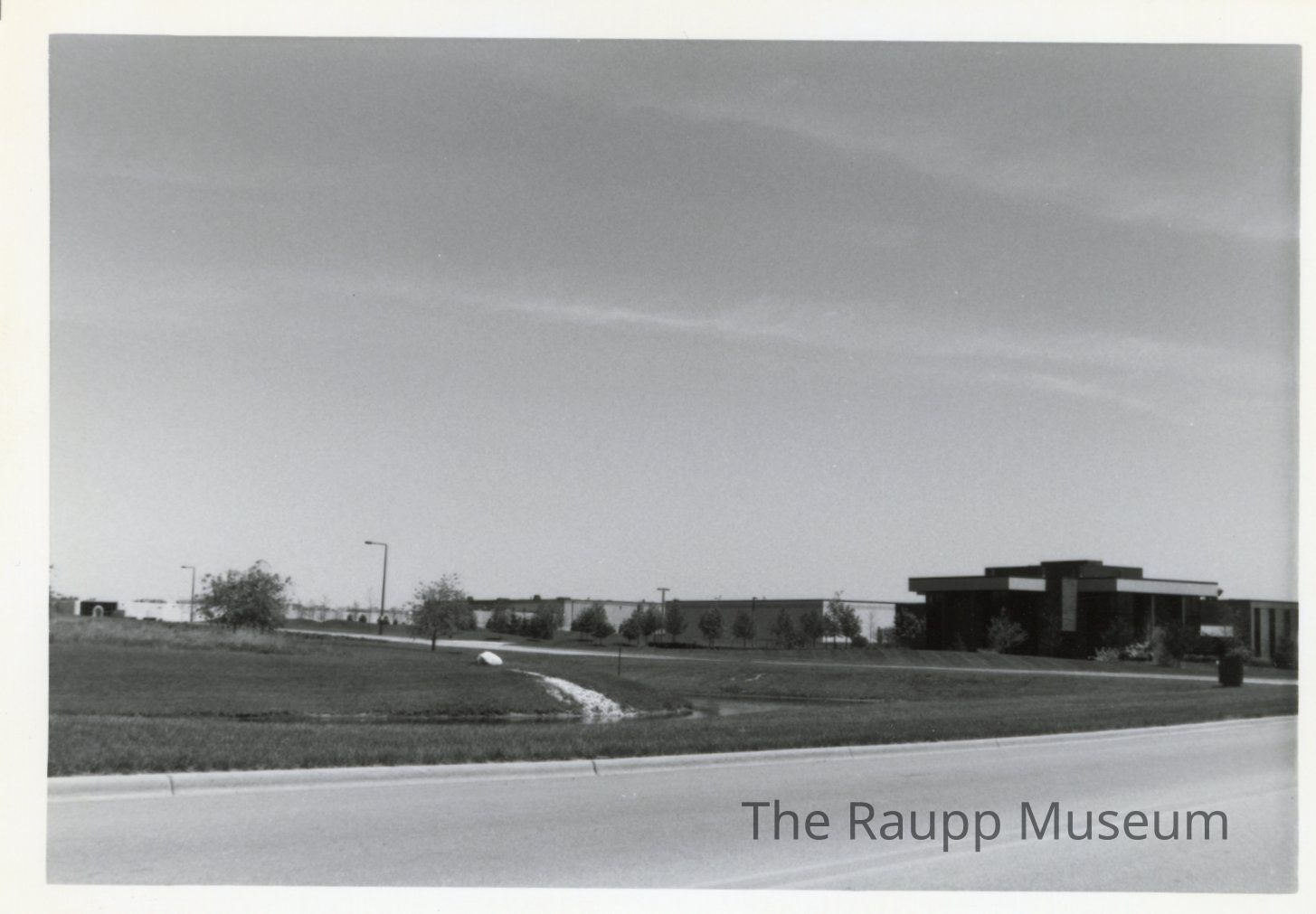 One (1) black and white photograph of a large line of buildings on the right and a stream in front, with a road in the foreground.Made/Created