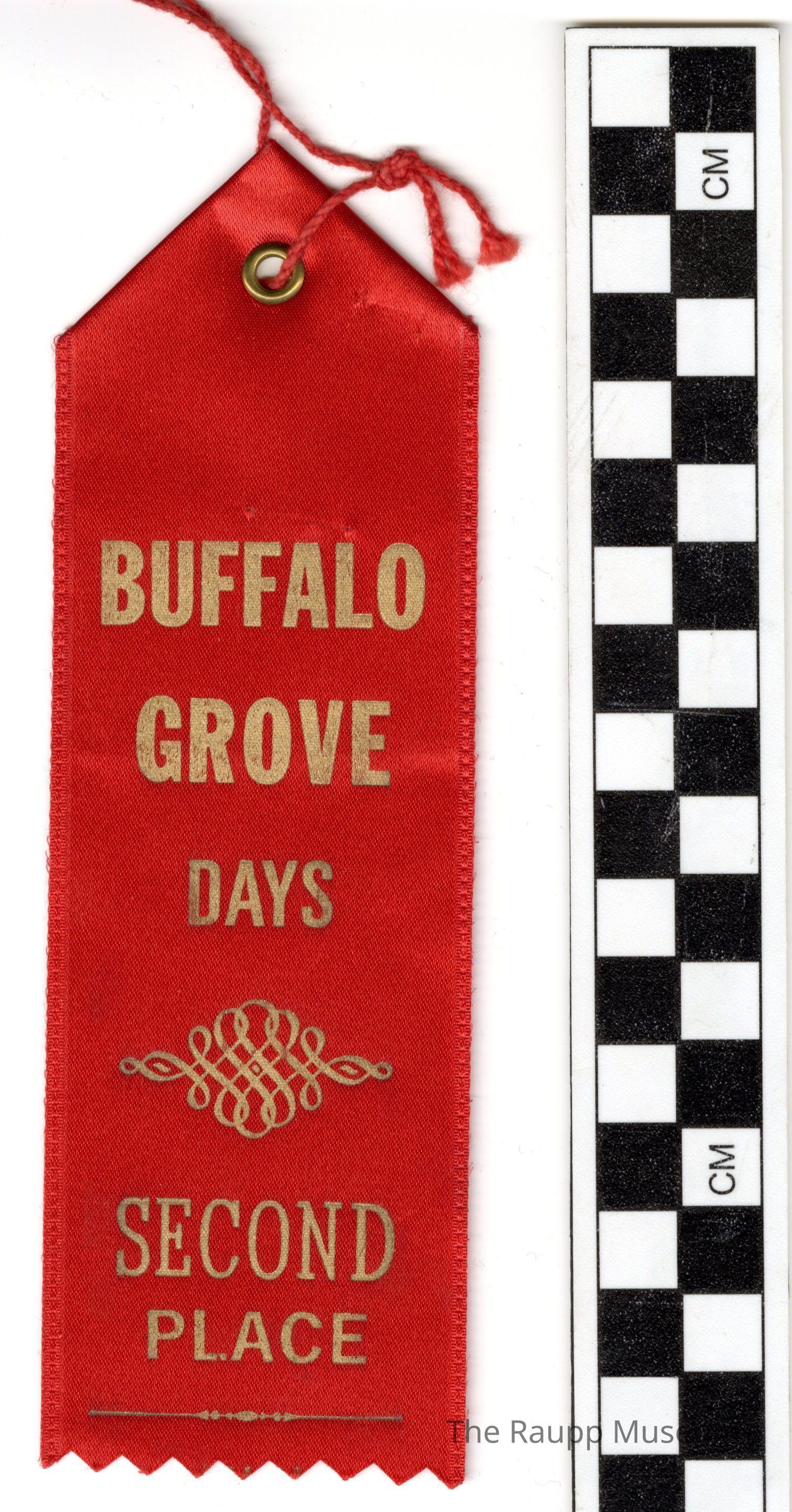 One (1) red prize ribbon for "Buffalo Grove Days Second Place". Attached to the back is a piece of cardboard with a mixture of printing and handwritten text for the event information. Printed is "Event, Contestant, Time, Date, Judge, Sports Award Co. Chicago, ILL." Handwritten is Event - "Baking", Contestant - "1", and Date - "9-2-79", and "Carrott Cake". On the front of the ribbon the text is in gold. The top is a triangle with a hole in the middle and a gold hoop with a red thread to hang the ribbon. On the bottom the ribbon is cut in a zig-zag pattern.Condition