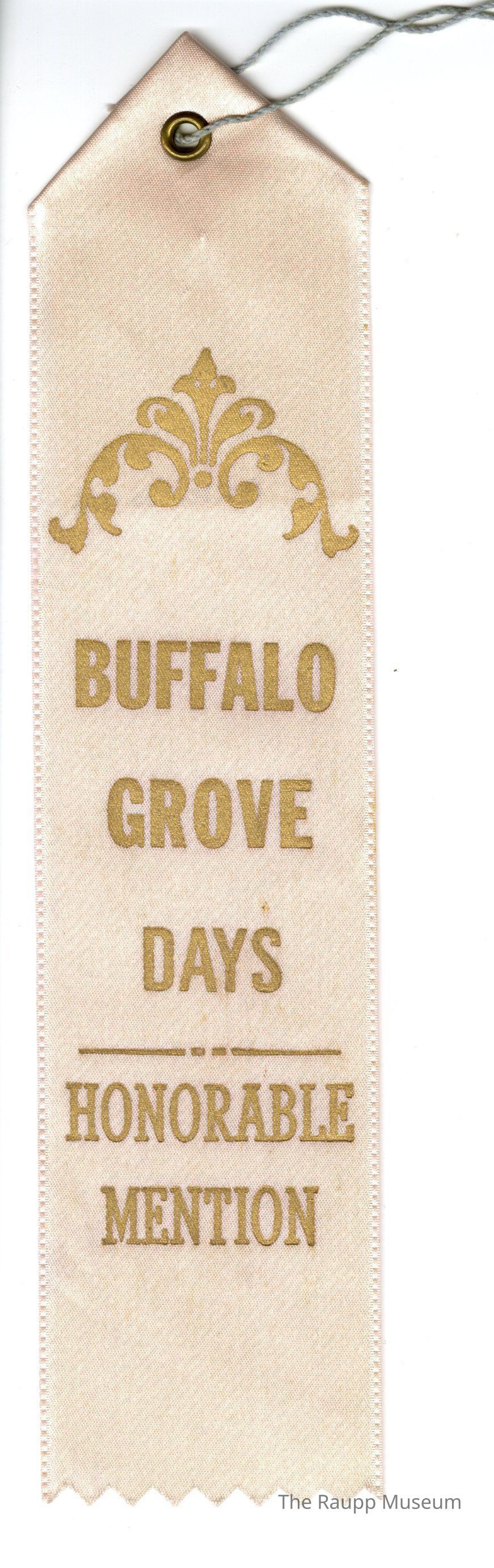 One (1) white Honorary Mention prize ribbon for canning at BG Day. One the back is a paper tag with award info handwritten - Dill Pickles.