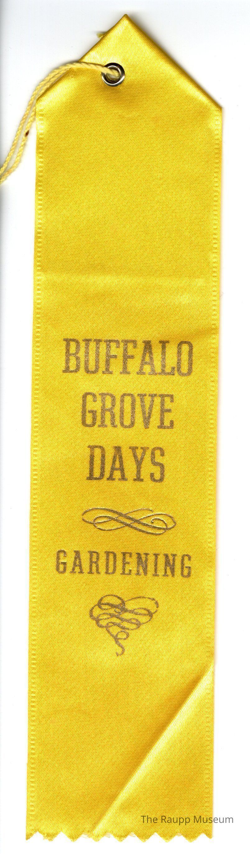 One (1) yellow prize ribbon for Gardening at BG Day. One the back is a paper tag with award info handwritten - Petunias.