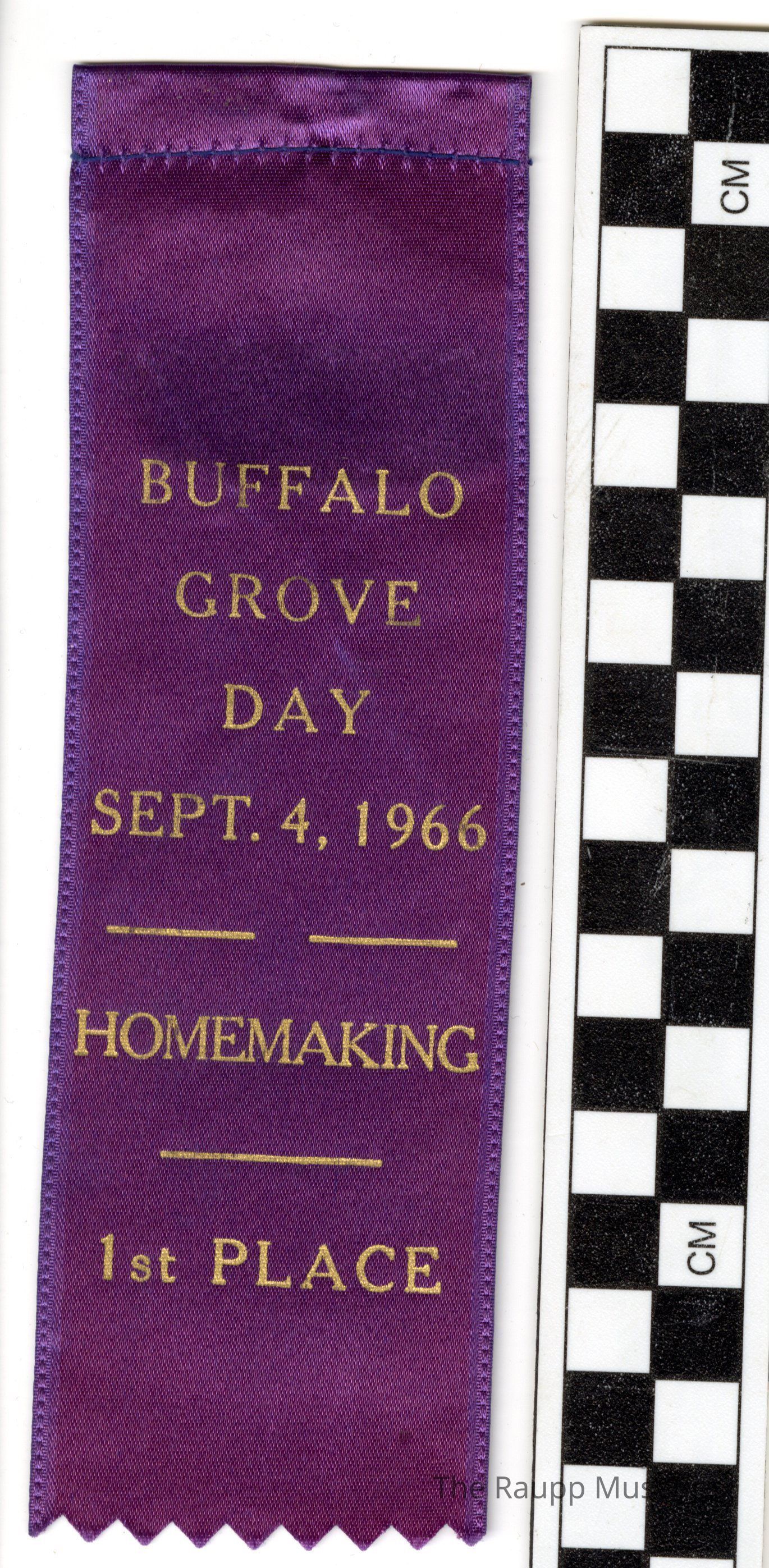 One (1) purple prize ribbon for "Buffalo Grove Day Sept. 4, 1966, Homemaking, 1st Place". Attached to the back is a piece of paper with handwritten "Plums Canning Contest". On the front of the ribbon the text is in gold with lines between each text block. The top has a loop across for hanging the ribbon. On the bottom the ribbon is cut in a zig-zag pattern.Condition