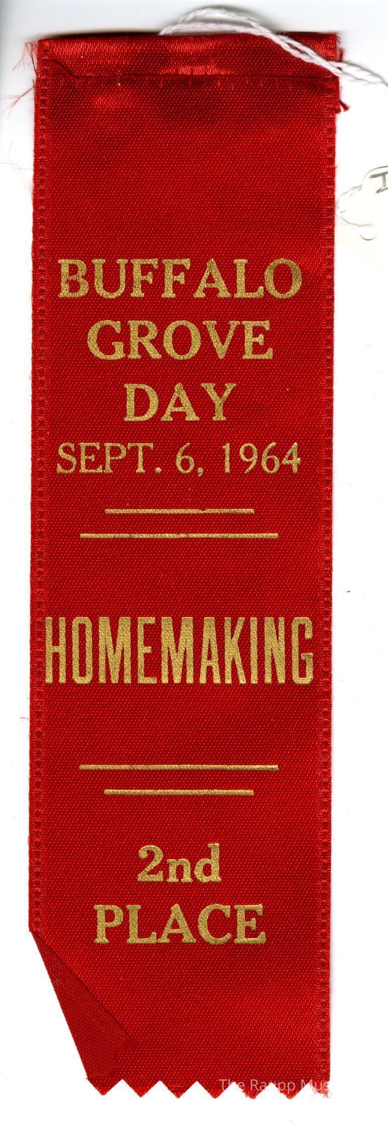 One (1) red prize ribbon for Buffalo Grove Day, 2nd place.