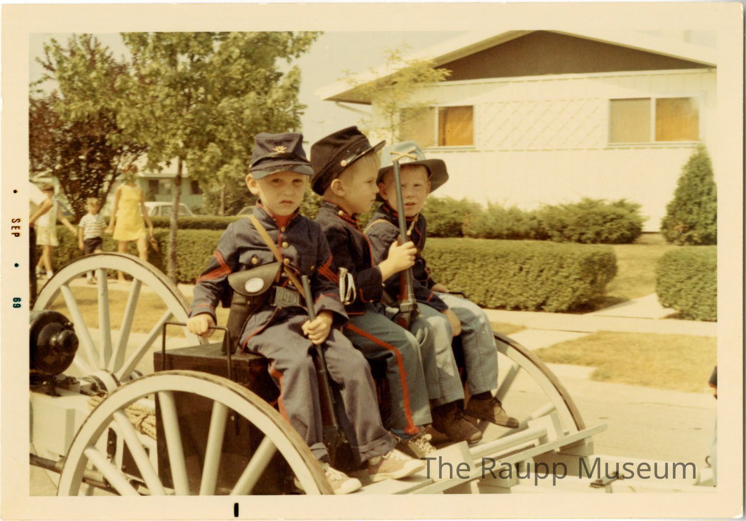One (1) color photograph of three children riding on a wagon. They are dressed in Union soldier Civil War outfits, with small toy guns. They have on three different hats, two caps and a cowboy still blue hat. Two boys have blue pants with red stripes and the other boy has blue jeans on.Made/Created