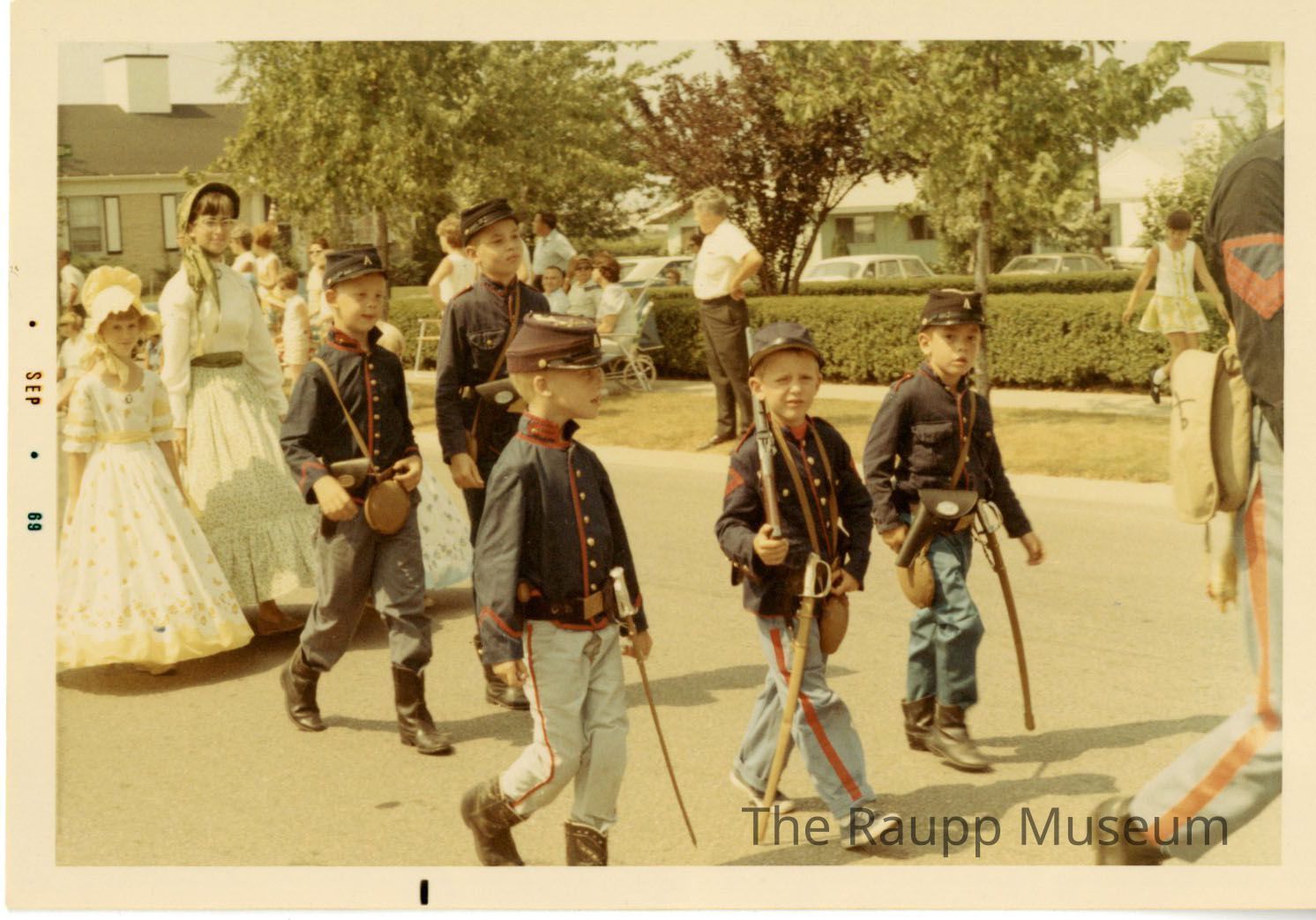 One (1) color photograph of children walking in the Buffalo Grove Days parade. There are five boys (three in front, two in back) wearing Civil War union style uniforms, with blue and red striped pants, a navy gold button top with red fringe, and blue caps. They have swords and guns accessories as well. Behind them are three girls in civil war era style dress, with large bottoms and bonnets. There are spectators on the grass on the other side.Made/Created