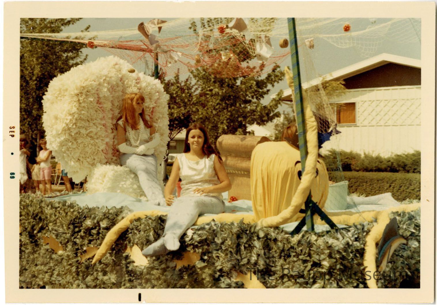 One (1) color photograph of women on float dressed as mermaids. There are two women with white tops and blue fins. One women is seated with brown hair facing the camera, the other is seated on a flower decorated clam shell. Above them are fishing nets. There appears to be another girl seated just out of vision on the right. There is a treasure chest on the float as well with green leaves surrounding the float.Made/Created