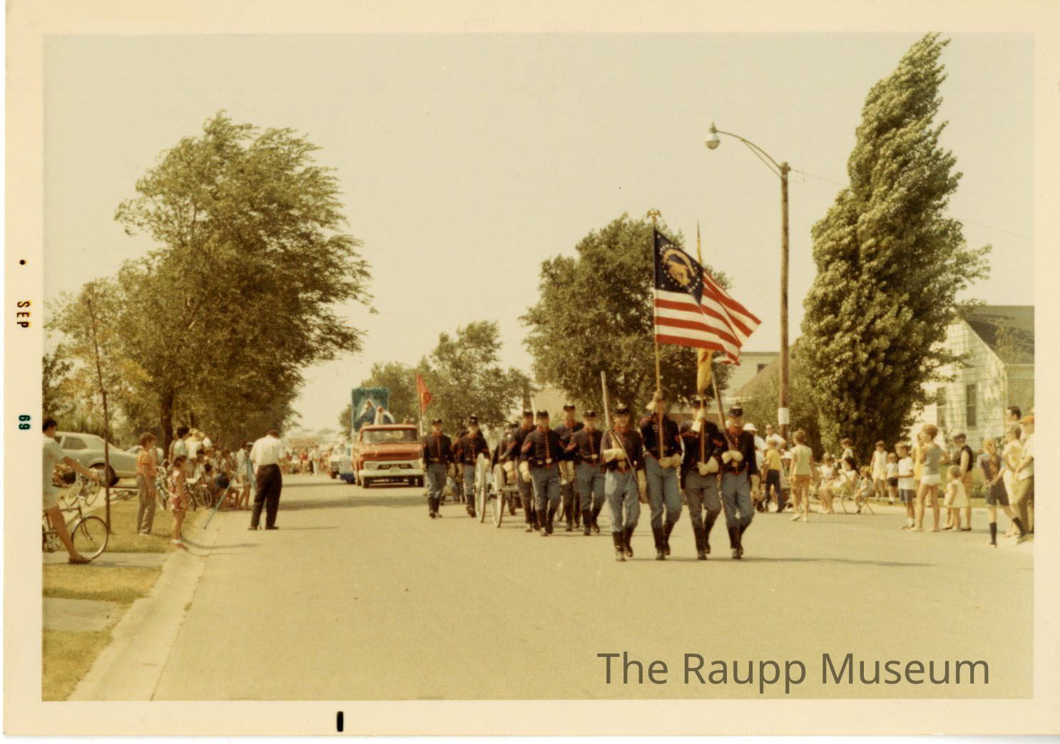 One (1) color photograph of men in civil war union outfits. They are marching in four rows on four individuals with a white wagon in the center. The men in the front middle are holding an old American flag and unidentified yellow flag. Behind them is a red truck towing a blue and white float. There are people on each side of the sidewalk watching the parade.Made/Created