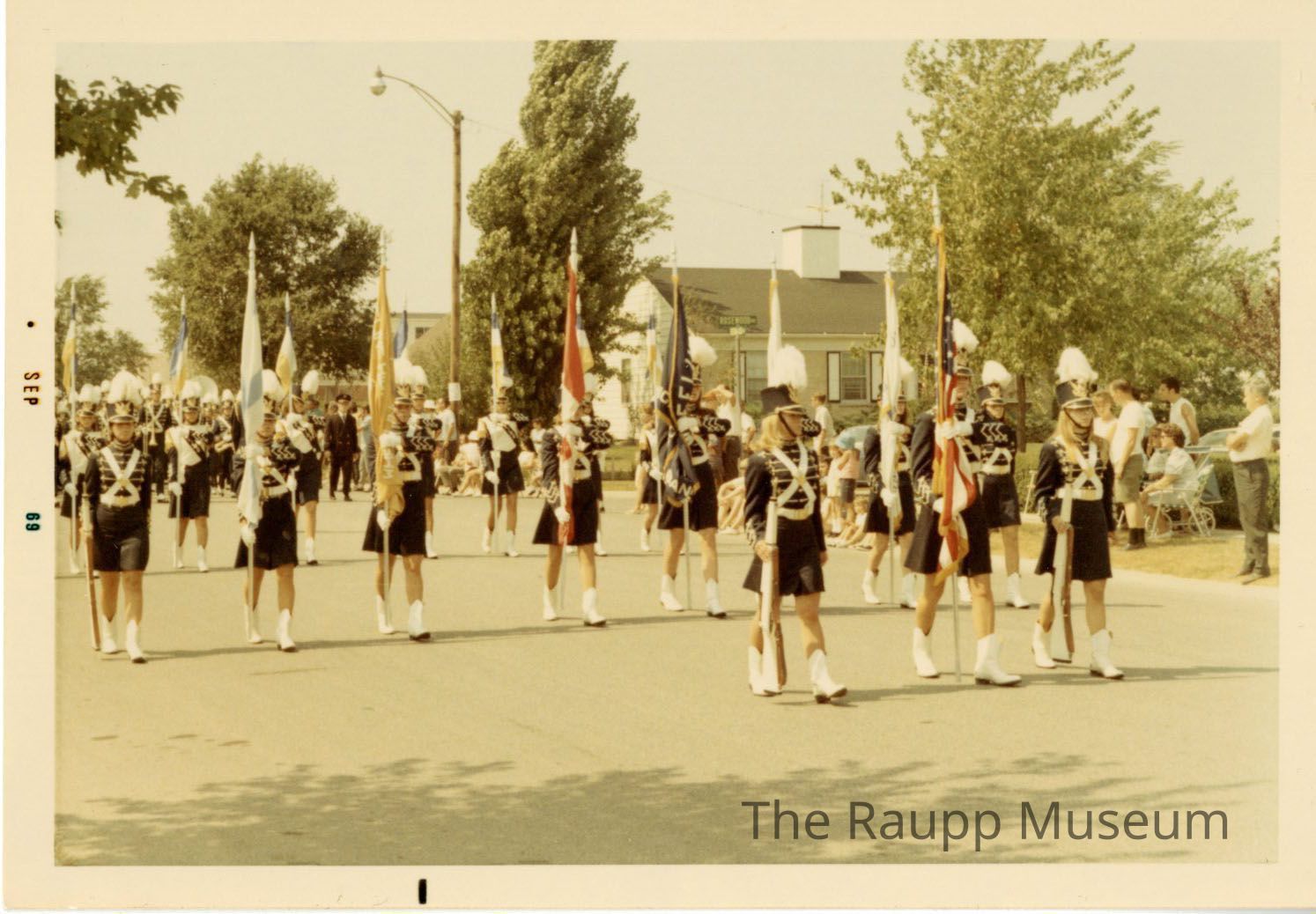 One (1) color photograph of young women marching in the Buffalo Grove Days parade. They are wearing navy skirts with navy/black long sleeve marching coats. There are gold embroidered lines on the coat. They have tall decorated navy and gold hats with white feathers on top. The girls are leading the marching band, and each girl is holding a different flag at rest. In the front are three girls, the two on the end holding a white gun, and the middle one holding the American flag. There are spectators on the sidewalk.Made/Created