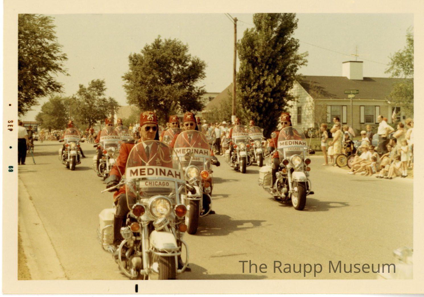 One (1) color photograph of men on motorcycles. The Motorcycles have "Medinah Chicago" printed on the front, with white, red, and orange lights. They are wearing red suit/blazers with black pants and a red tall hat that has the "medinah" logo on it. There are people seated and standing near the curb and there are 10 men (visible) on motorcycles. On the left is one man leading. Behind them is a float with "Drugs" on it. In the bottom right corner is the silver back of another motorcycle.Made/Created