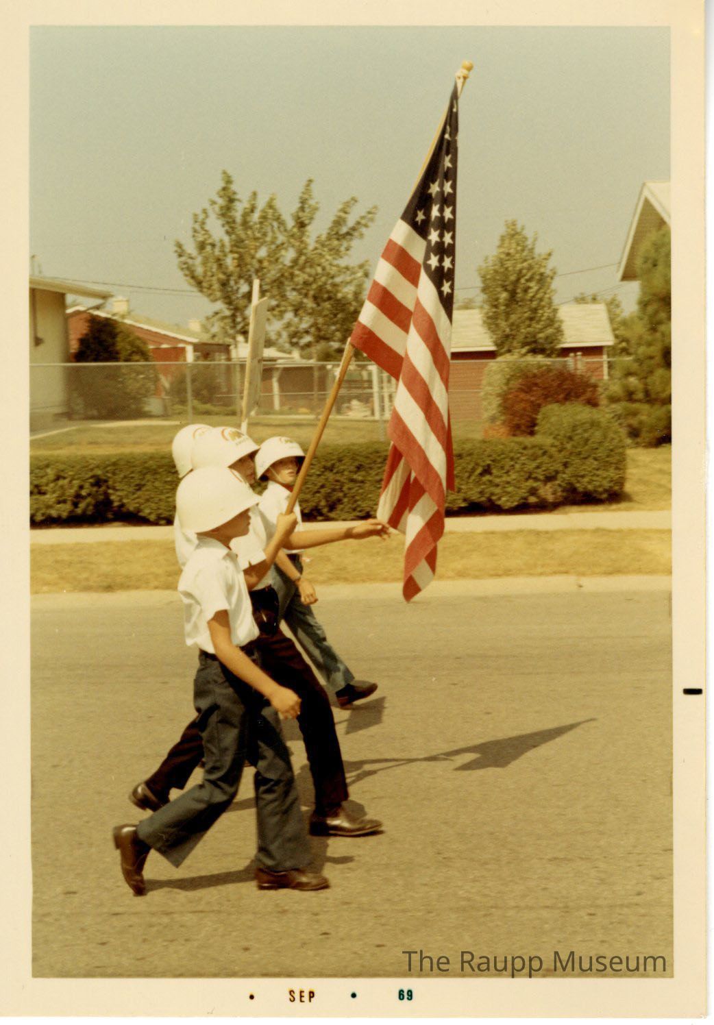 One (1) color photograph of four young boys walking in the Buffalo Grove Days parade. They are dressed in dark blue or black slacks with white short-sleeved shirts. They have on brown shoes. The second from foreground is holding the American flag. They all has white helmets on with an unidentifiable logo. Behind them are red houses and backyards.Made/Created