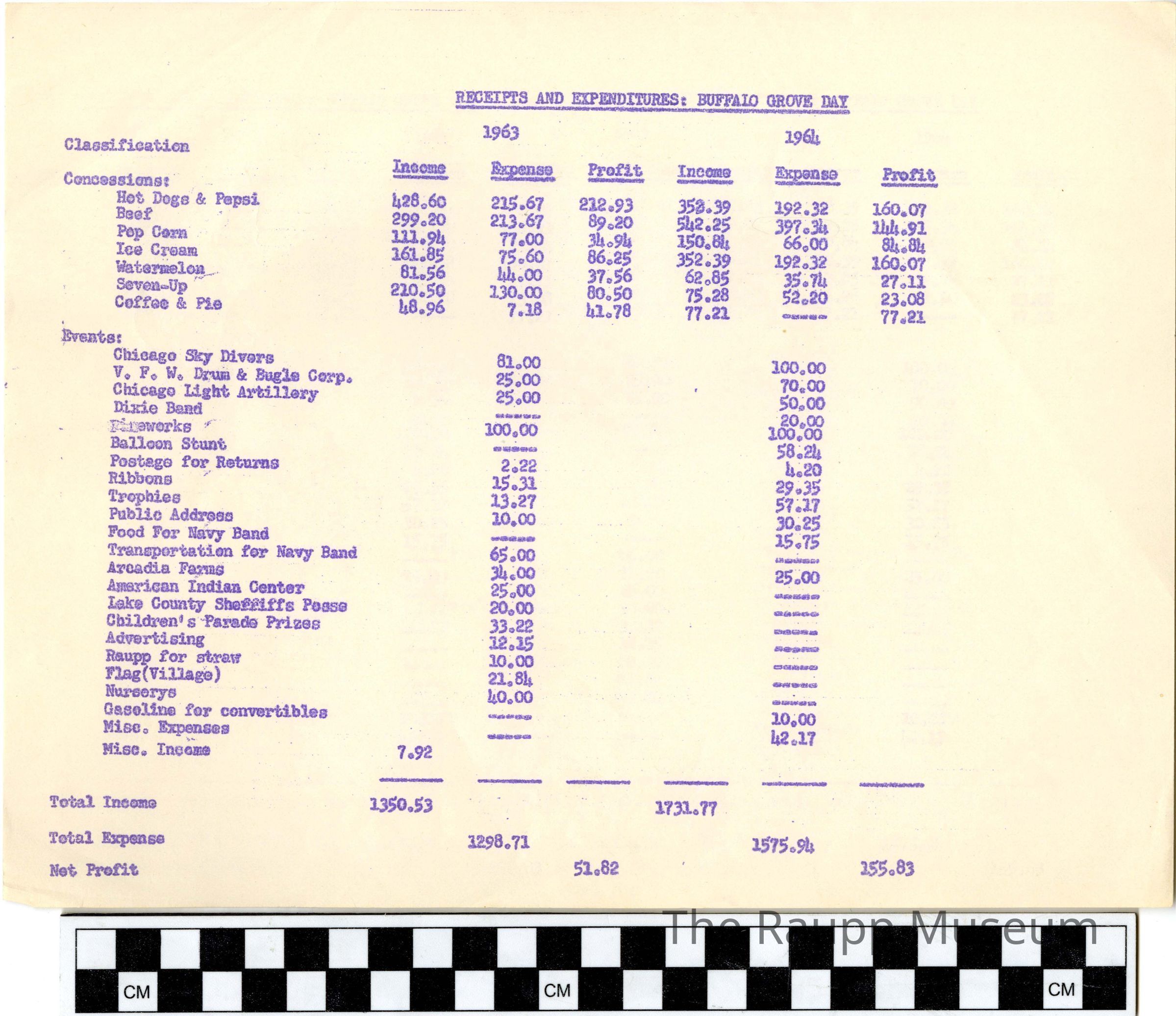 One (1) single page report about the receipts and expenditures for Buffalo Grove Day 1963 and 1964. Included are Concessions and Events Income, Expense, and Profit. Total income for 1963 was 1350.53, 1964: 1731.77, expense 1963: 1298.71, 1964: 1575.94 and profit 1963: 51.82 and 1964: 155.83. Text is blue.Archive Details