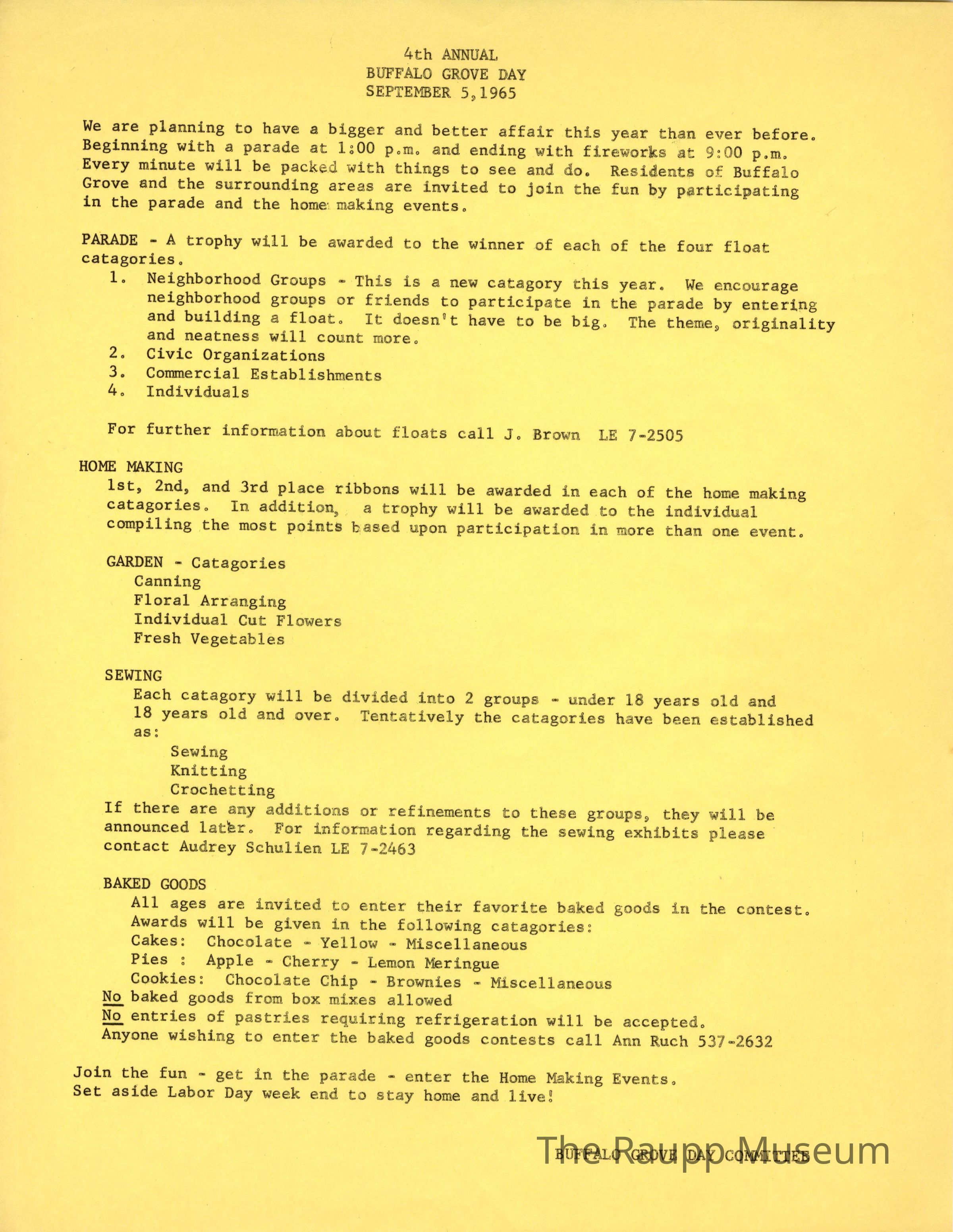 One (1) 1-page pamphlet outlining the events and how to enter for Buffalo Grove Days 1965. Listed in the pamphlet are the categories for the Parade trophies, Home Making (Garden, Sewing, and Baked Goods).