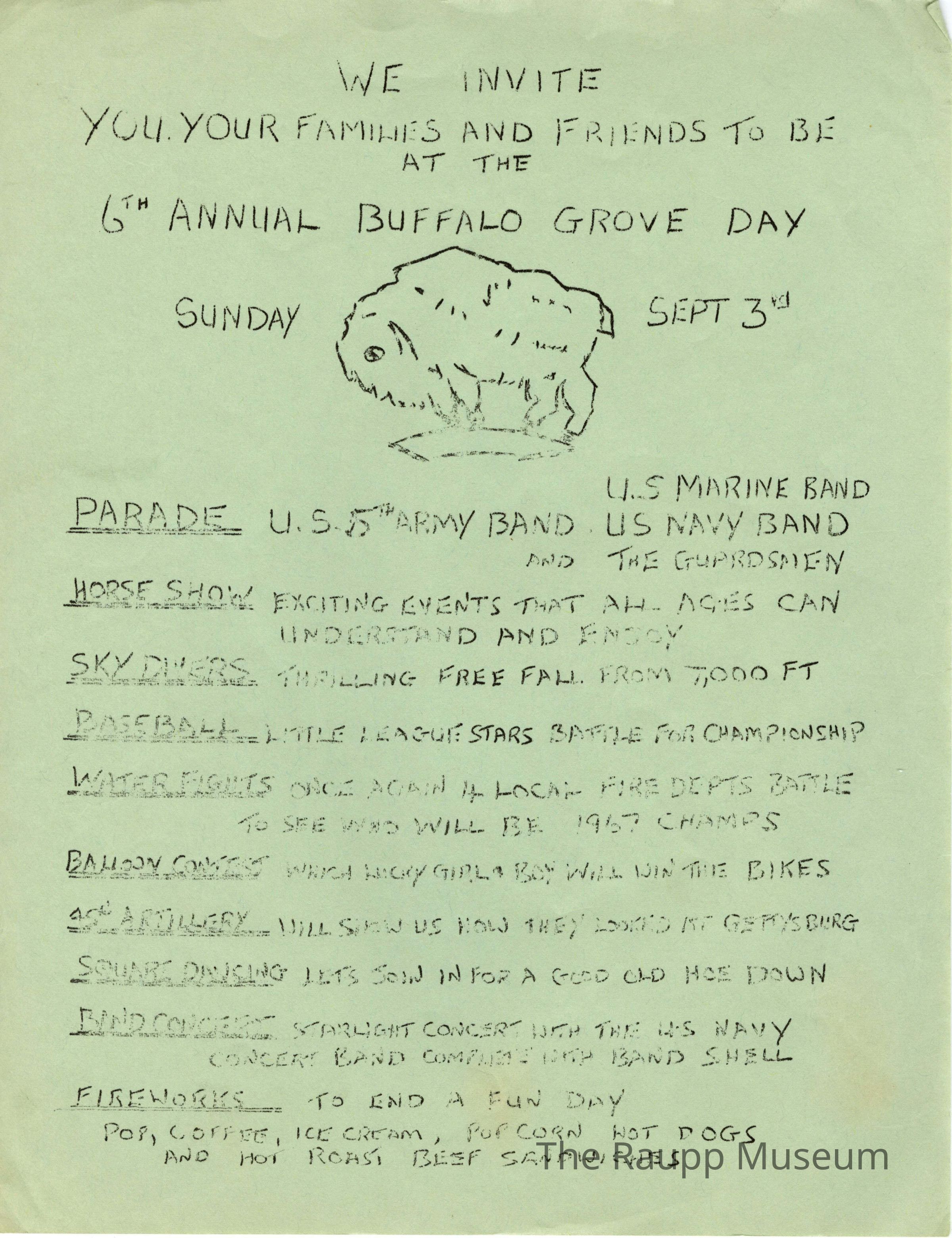 One (1) 1-page pamphlet advertising the events and activities at Buffalo Grove Days 1967. The pamphlet is green with black handwritten (but a copy) text. There is a drawing of a buffalo on top. Activities included are a parade, horseshow, skydivers, baseball, water fights, balloon contest, 45th artillery, square dancing, band concert, and fireworks.
