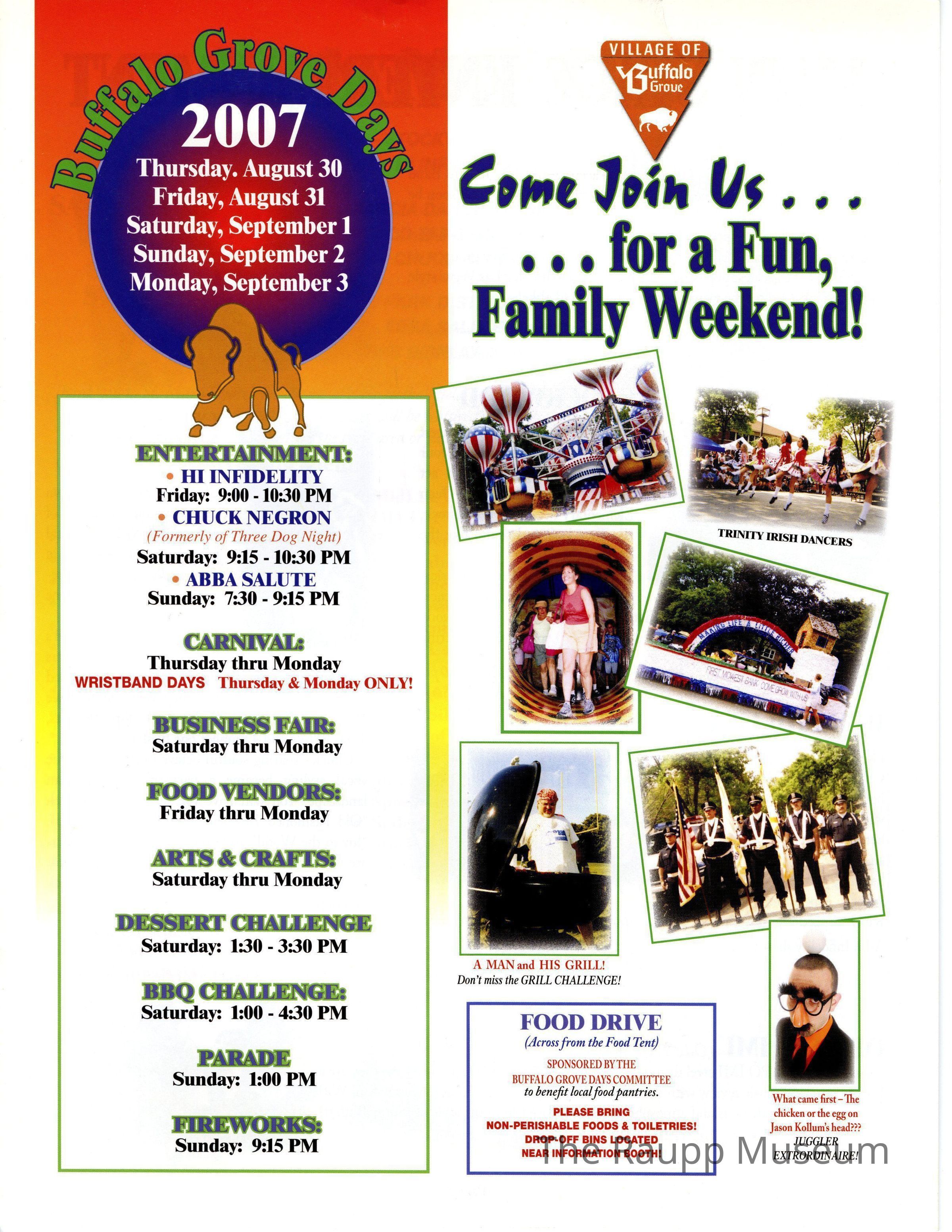 One (1) news pamphlet for BG Days 2007, containing information about the events, food, and schedule. News opens long edge, right to left like a pamphlet. It is colors with color photographs and printed on glossy paper. There are staples on the left side binding the paper.