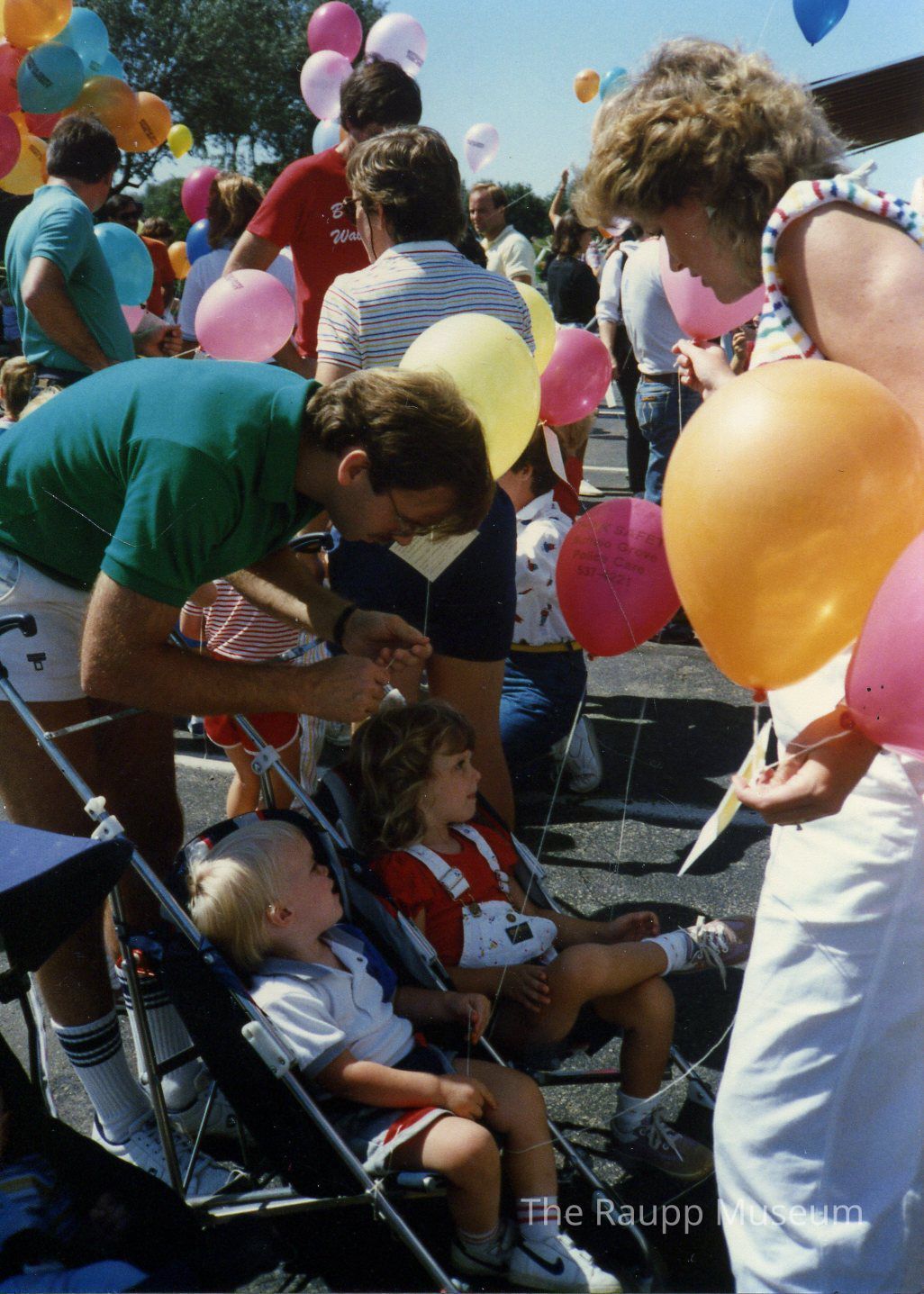 Color photographic print. Image of Buffalo Grove Days balloon launch. Man in green shirt tying yellow balloon onto a double stroller. Children seated in the stroller: girl wearing red shirt and white overalls, boy in white shirt holding pink balloon. Woman in multi-colored striped shirt holding orange balloon. People in background indistinguishable. reverse side has handwritten blue ink marking: "balloon launch-1986"