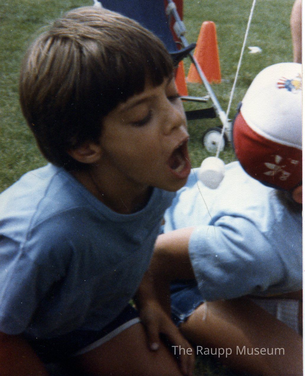Color photographic print. Image of a marshmallow eating contest. Image primarily of boy with blonde hair and wearing a gray shirt. Marshmallow on a long stick is in front of his open mouth. Another child is pictured to his right in a similar position. Image printed on Kodak paper with slightly textured surface. Marking on reverse side in blue ink: "B.G. Days Aug. 85"Dimensions