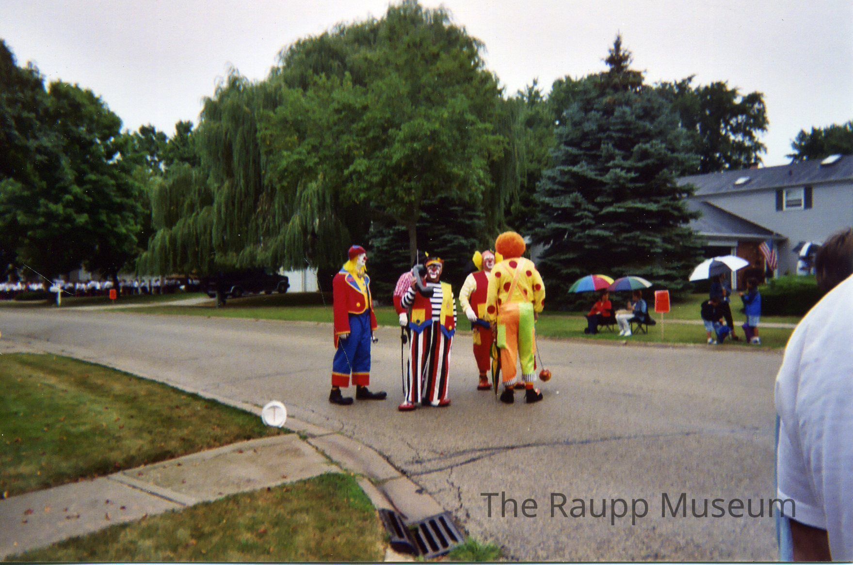 Color photographic print. Image of five clowns standing in middle of street waiting in the Buffalo Grove Days parade. One wearing orange hair, yellow shirt with red polka dots, green and orange pants; one has yellow hair, red shirt with white sleeves, and red pants; one holding black phone has black, white and red striped trousers. Image printed on DuraLife paper. reverse side marks: "Kodak perfect touch processing Oct/9/03 ID816707 <24A> EGK1