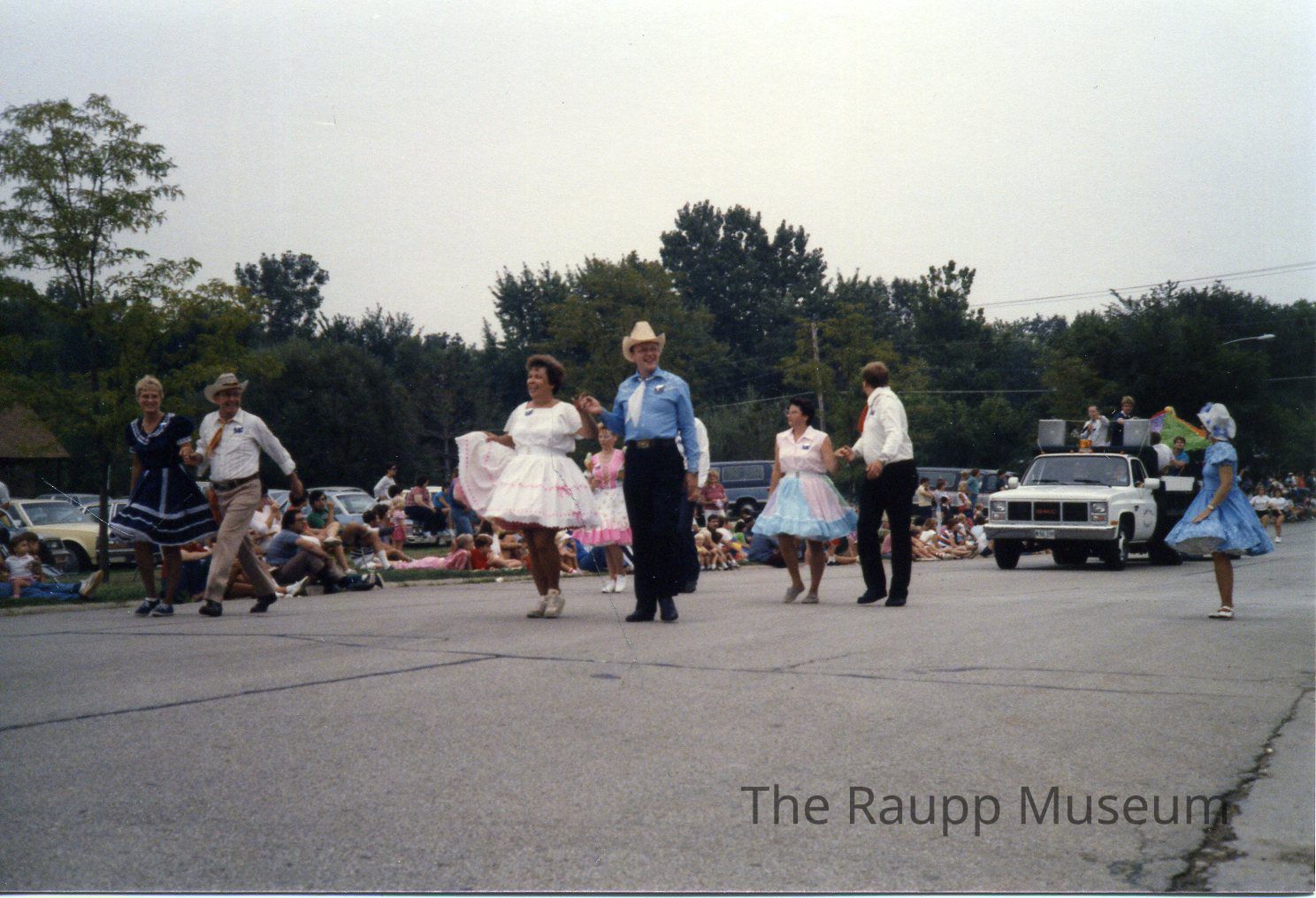 Color photographic print. Image of four couples walking in a parade. The men are each wearing a cowboy hat, collared shirt, tie, belted pants, and black shoes. The women are each wearing knee-length dresses with full skirts. Spectators line the left side of the street. Park District truck in the background.