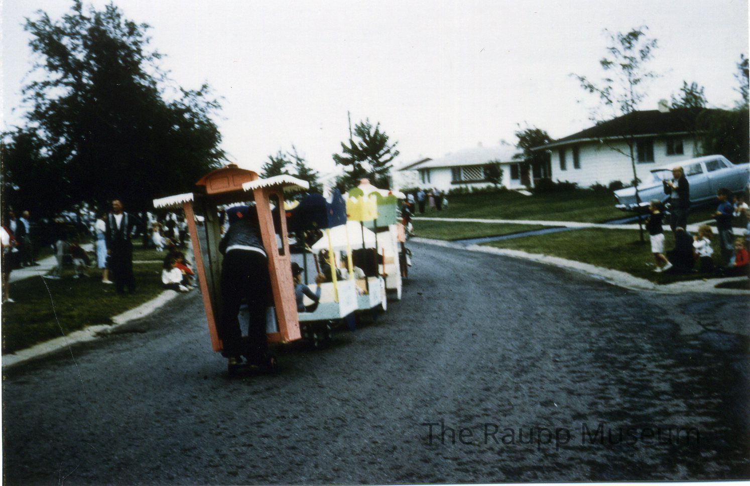 Color photographic print. Blurry image of a Buffalo Grove Days parade float. Image of the rear of a white and pink train float pulling colorful carts behind it. The carts have children sitting inside. Partial view of a man standing in the red caboose. Image printed on Fujifilm Pictro paper. reverse side text written in black ink: "1964; 1st Place; BG Days."
