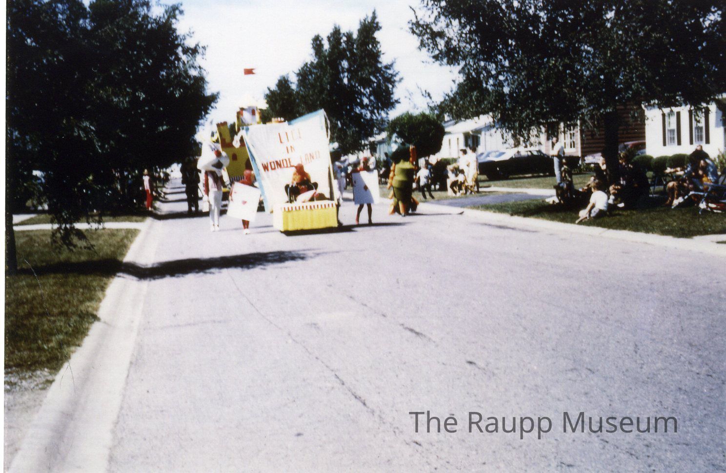 Color photographic print. Blurry image of the Buffalo Grove Days parade. Image of an Alice in Wonderland theme float and costumed characters walking down the street far away towards the camera. Image printed on Fujifilm Pictro paper. reverse side text written in black ink: "1965; 1st Place Div; BG Days."