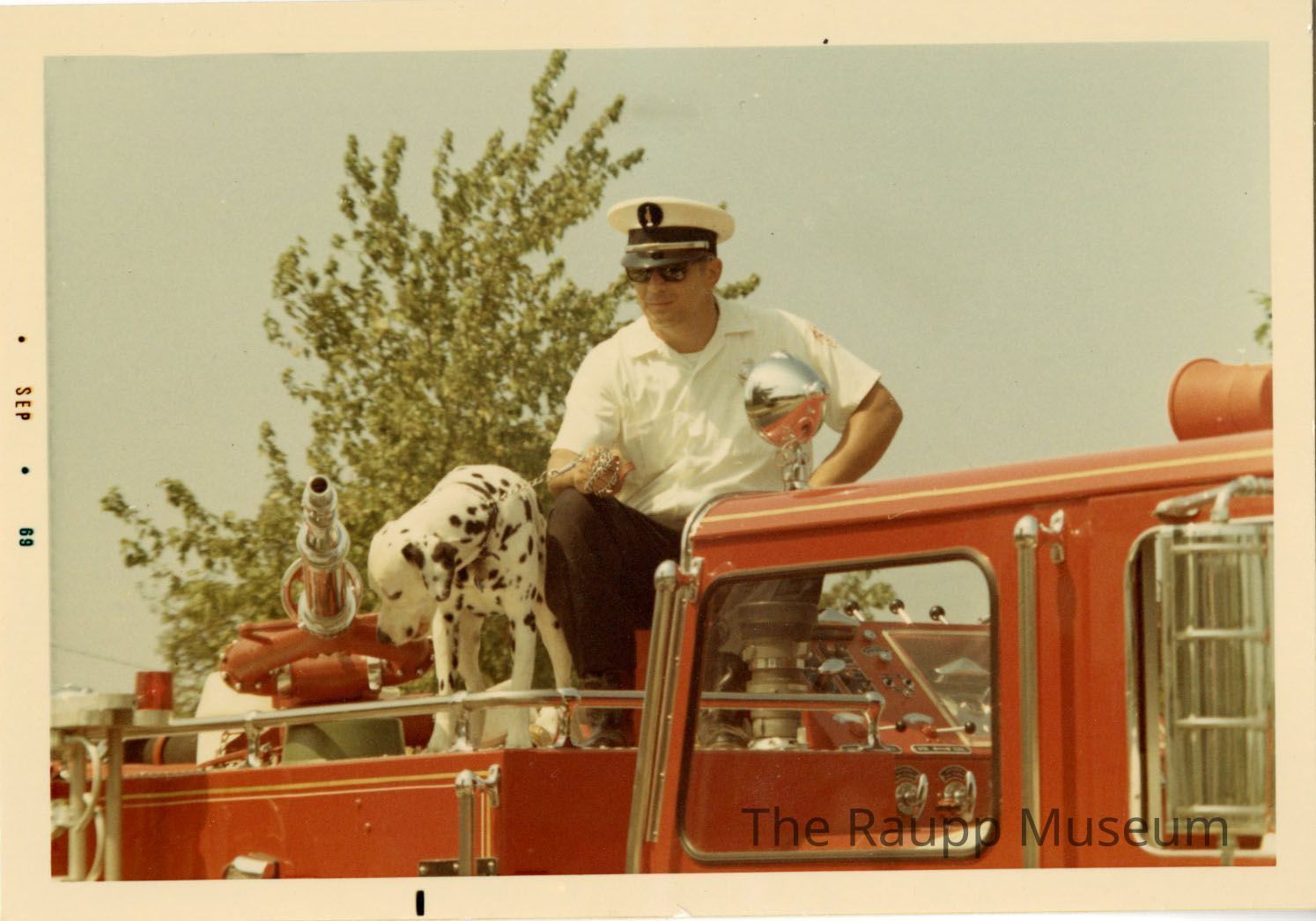 One (1) color photograph of the local firetrucks in the Buffalo Grove Days parade, 1969. Featured is the top of the red truck with a fireman dressed in black pants, white shirt, and flat hat, kneeling on top. He is holding on to the leash of a dalmatian standing next to him.Made/Created